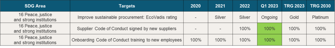 2023年,Scanfil的公司合规性目标为:实现EcoVadis金牌评级;为所有新员工提供入职行为准则培训;确保所有新供应商签署《供应商行为准则》。第一季度,100%的新供应商签署了《供应商行为准则》;100%的新员工进行了入职行为准则培训。此外,EcoVadis金牌评级的筹备工作正在按计划进行。