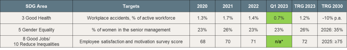2023年,Scanfil的社会责任目标为:将工作场所事故(占在职劳动力的百分比)降至1.2%,并将女性在高级管理层中的比例提高至26%。第一季度,工作场所事故占在职劳动力的比例为0.7%,女性在高级管理层中的比例为23%。为了防止工作场所事故,我们对事故发生比例较高的工厂实施了更严格的报告和审计。此外,我们成立了Scanfil DEI(多样性、公平性和包容性)论坛,并于4月底组织了第一次会议。