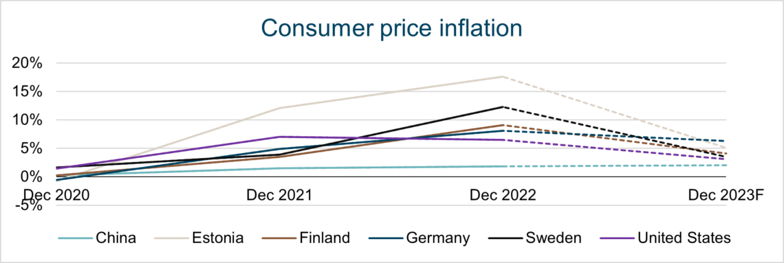 Forecasts for 2023 are mainly expecting consumer price inflation (CPI) to cool down and prices still to rise but at a slower pace. In 2022 we did not see high wage increases, but there will be a delayed effect in 2023 as salary increases taking effect from 2023 onwards will be negotiated. Raw material prices, including metals, experienced dramatic price reactions in 2021 and 2022, but they seem to have subsided for now.